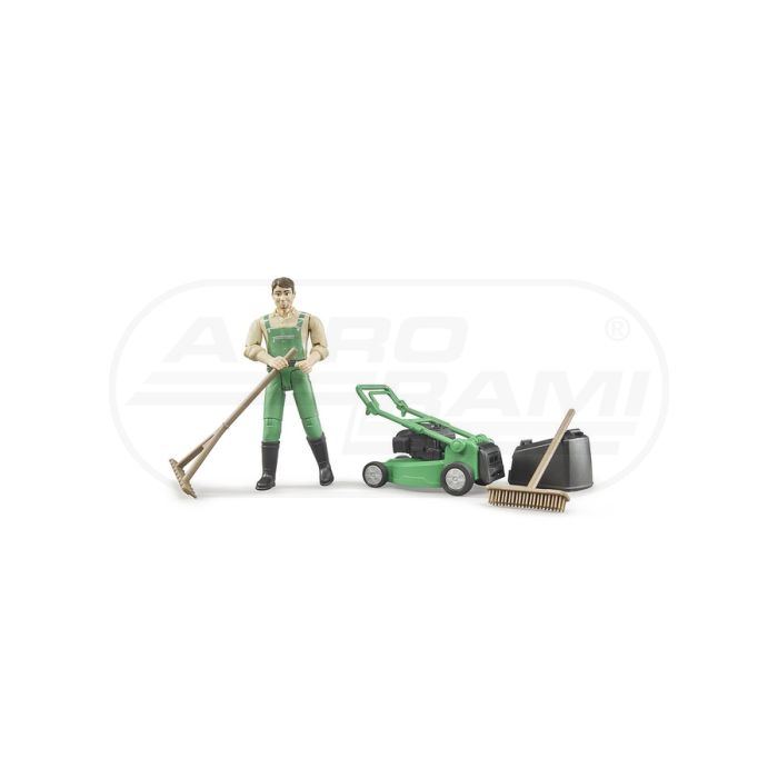 Figúrka záhradníka s kosačkou, hrabľami a metlou Bruder 62103
