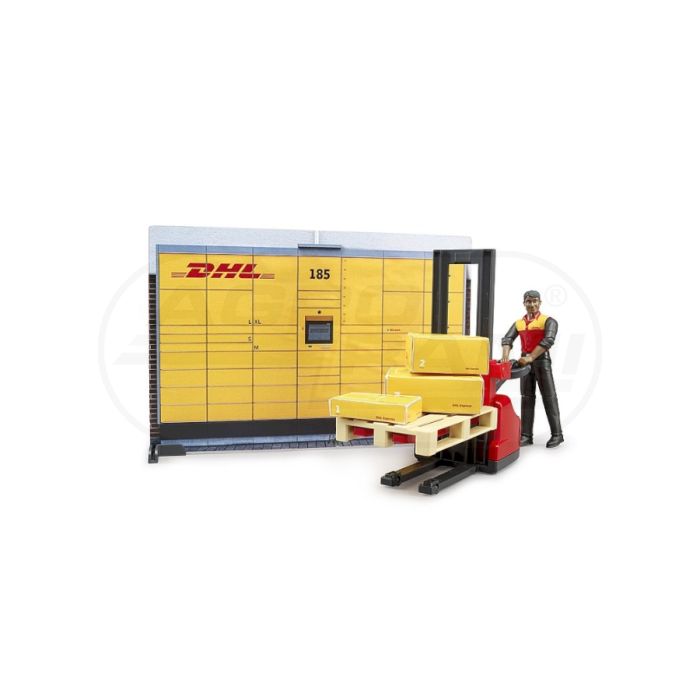Obchod Bworld DHL s ručným paletovým vozíkom a figúrkou Bruder 62251